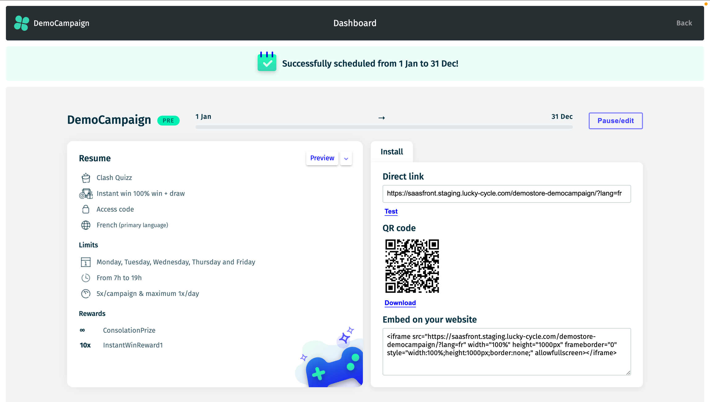 The first block offers a quick overview of your campaign parameters, making it easy to verify settings at a glance. It also provides essential elements for integrating the campaign into your website or sharing it effectively: