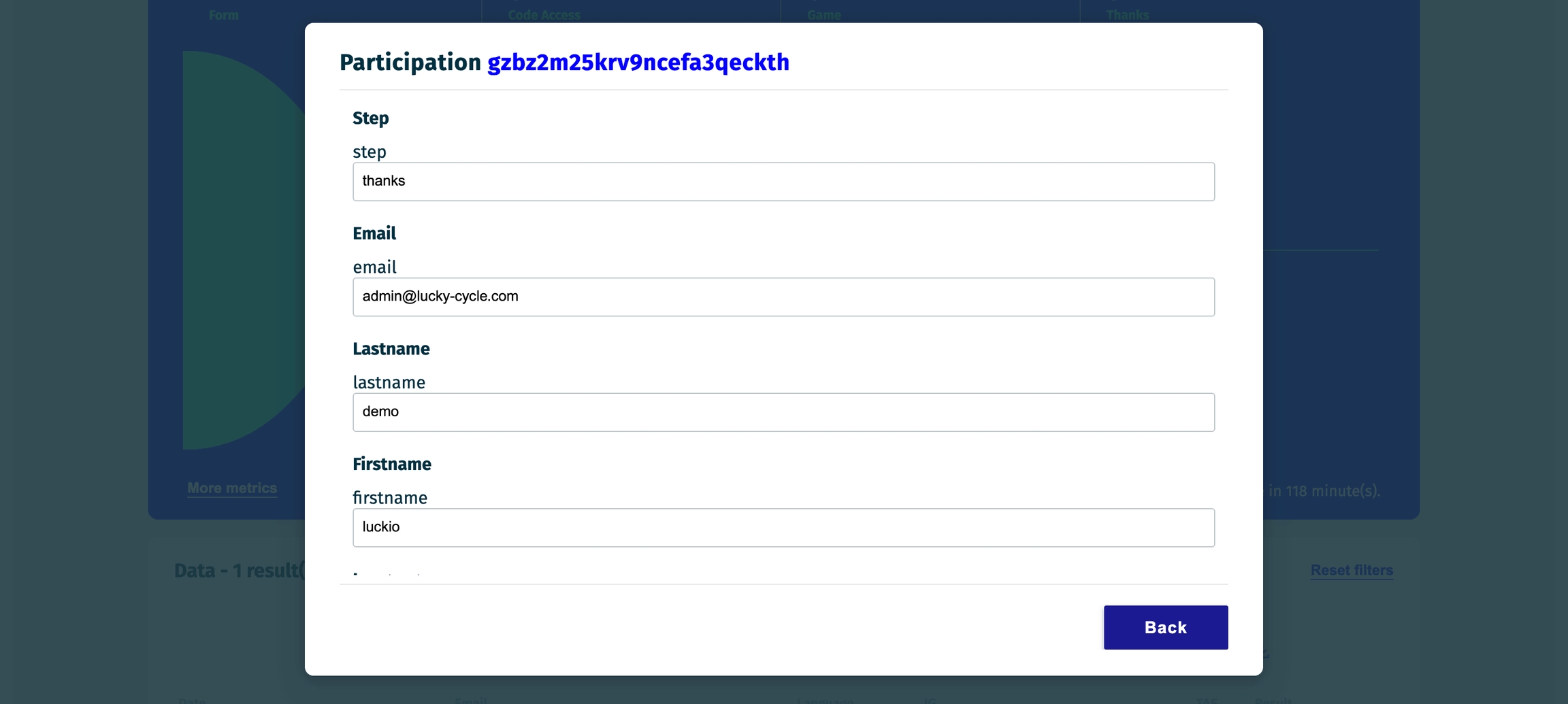 Clicking on a specific participation opens a modal window displaying detailed information, such as the participant's submitted data, the time of participation, and any rewards they have won.