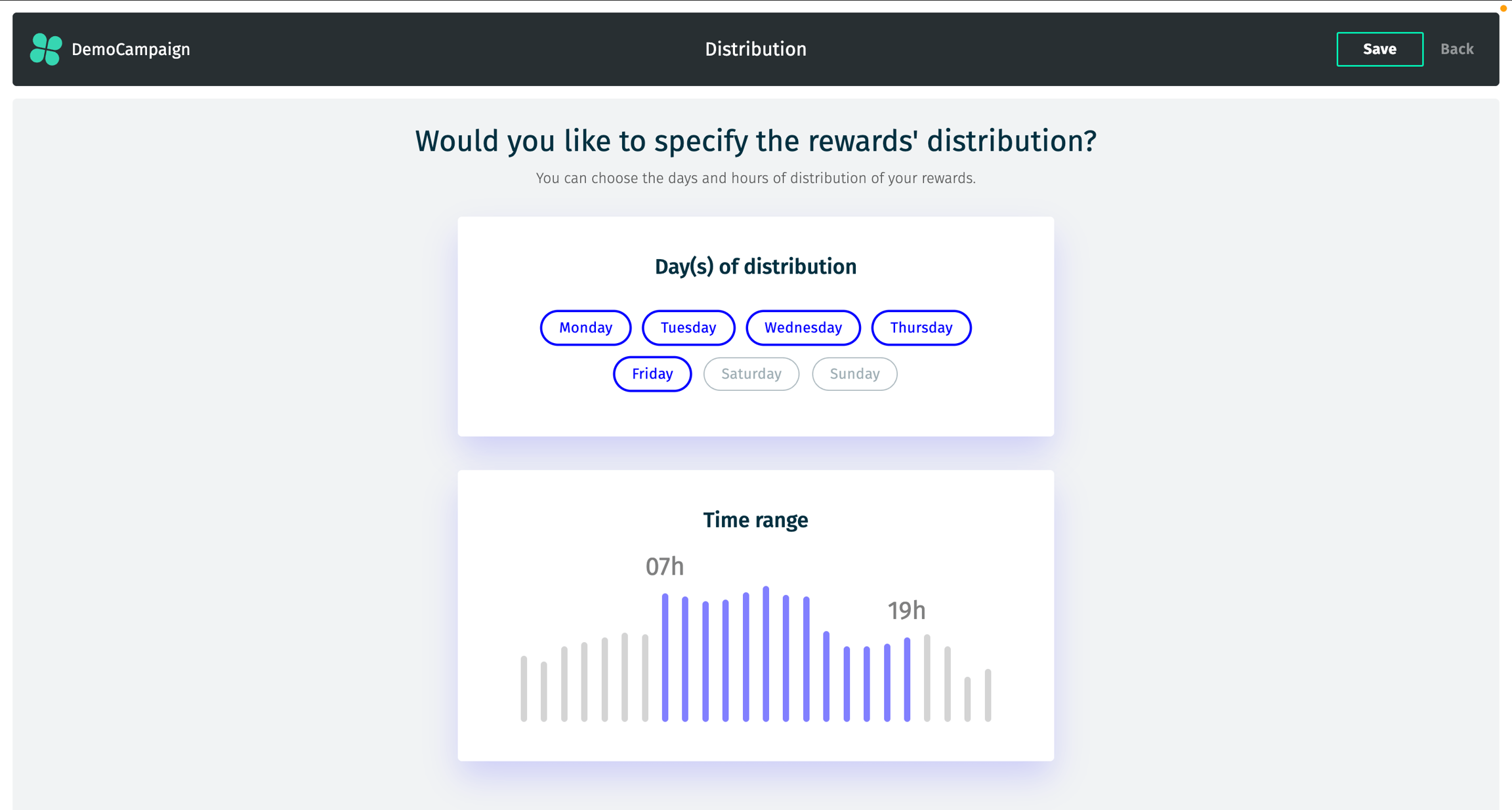 The Distribution page allows you to limit prize distribution to specific days of the week and time ranges. This feature is particularly useful for in-store campaigns or if you prefer not to distribute prizes during the night.