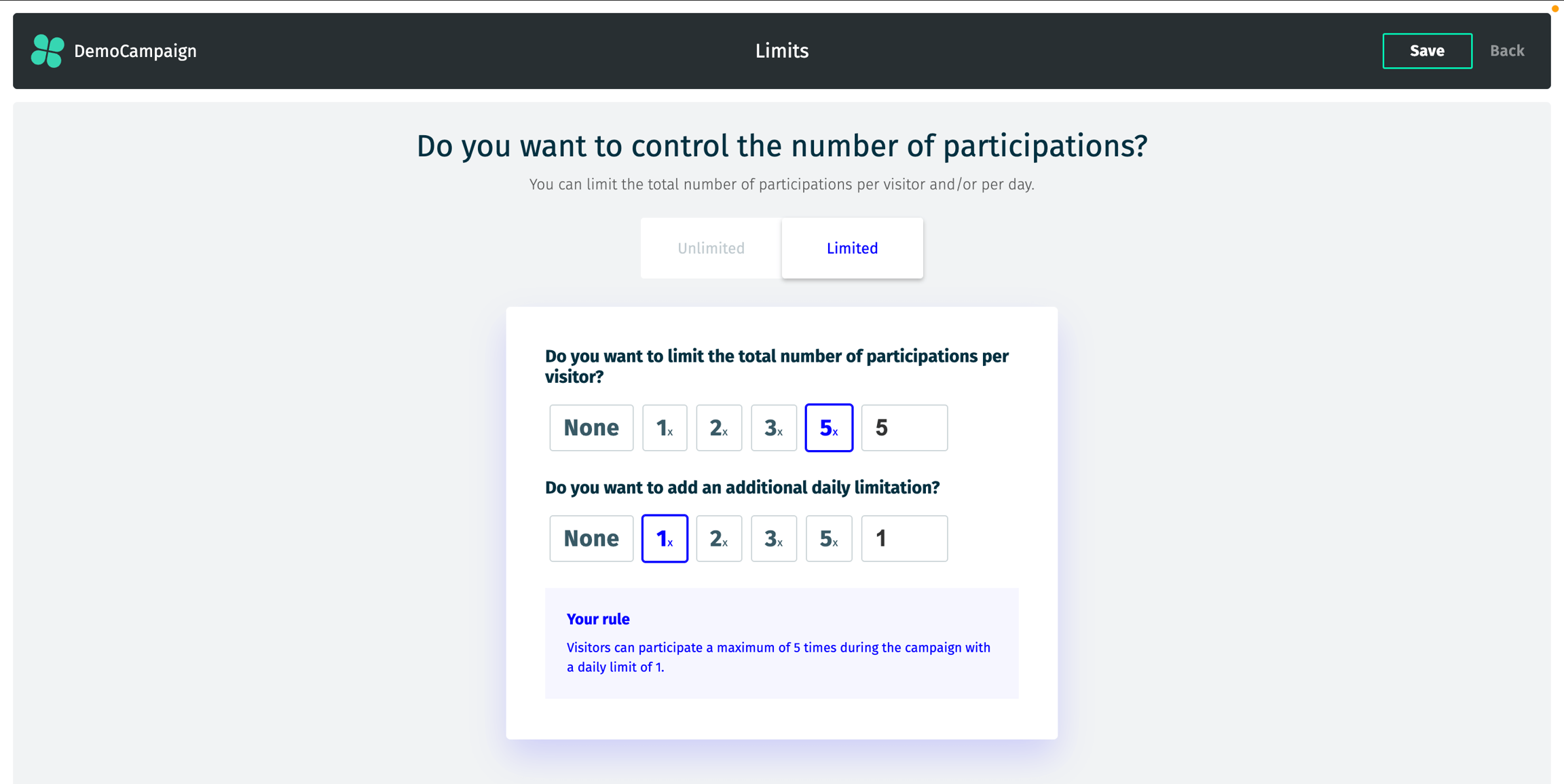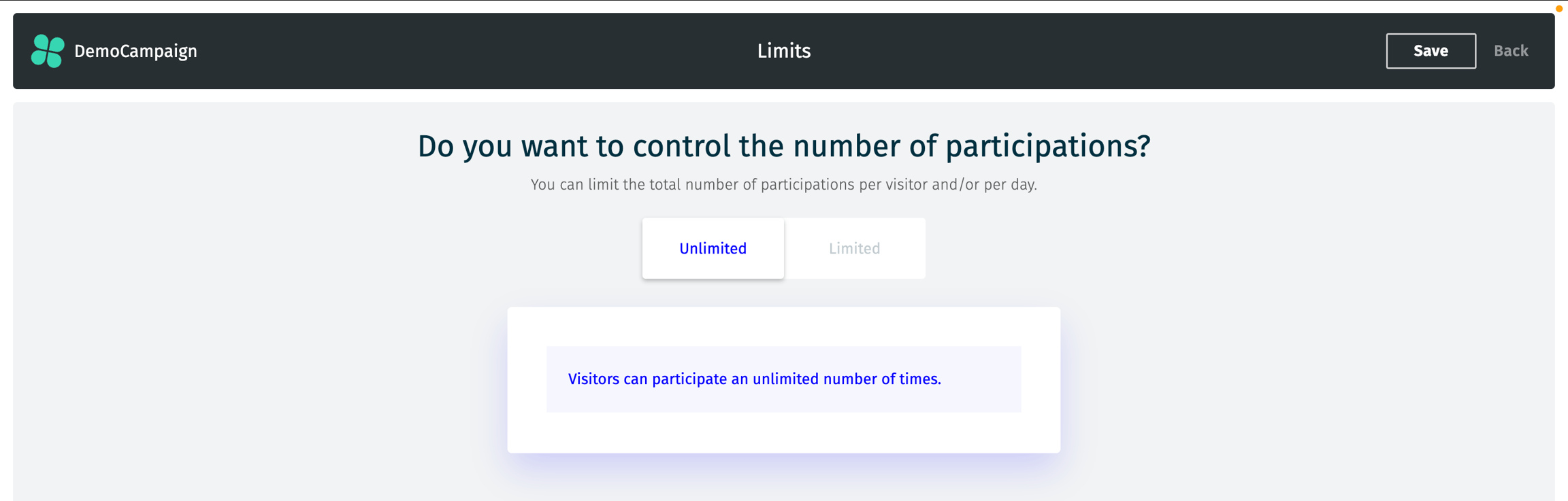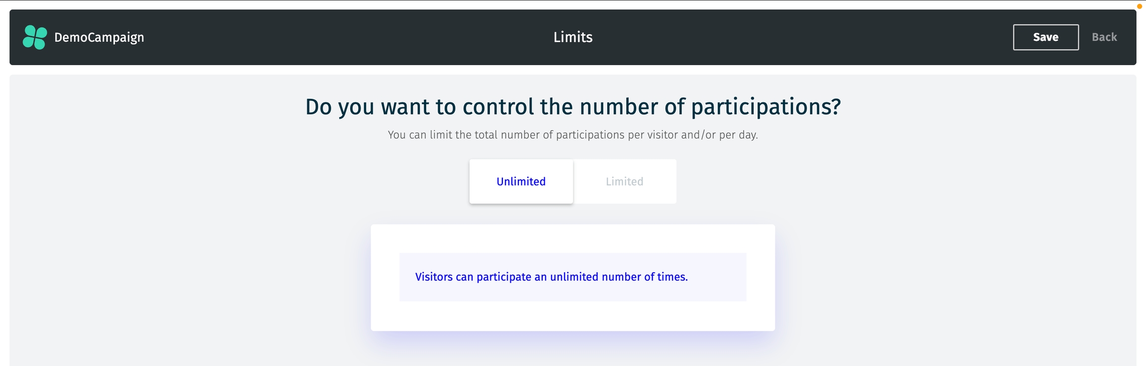 The Limits page allows you to set specific restrictions based on the email address of the end-user. By default, no limits are applied, but you can choose to limit both the total number of participations and the daily participations.