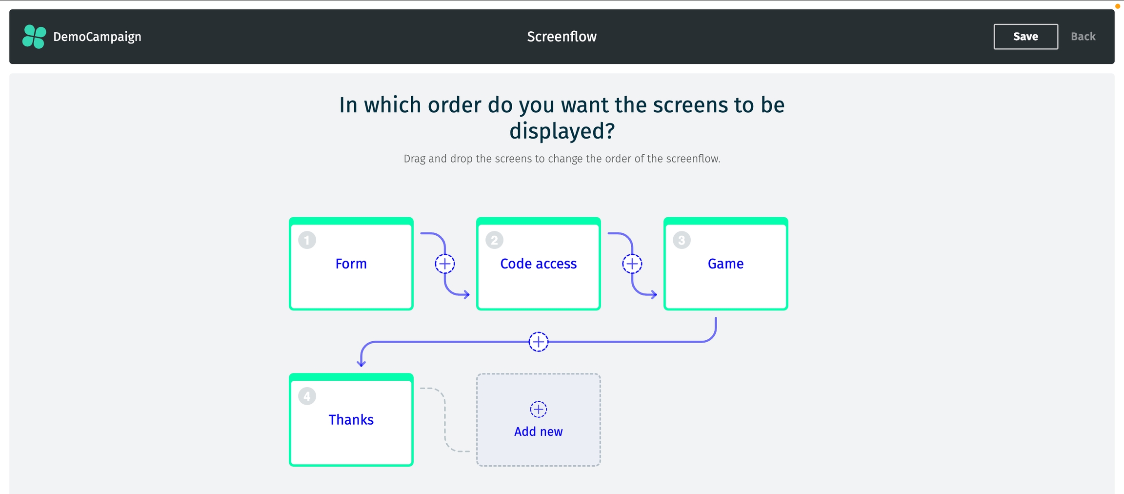 The Screenflow page allows you to choose the navigation flow for your campaign. The available screens are as follows (you can see them in action in the Screens section):