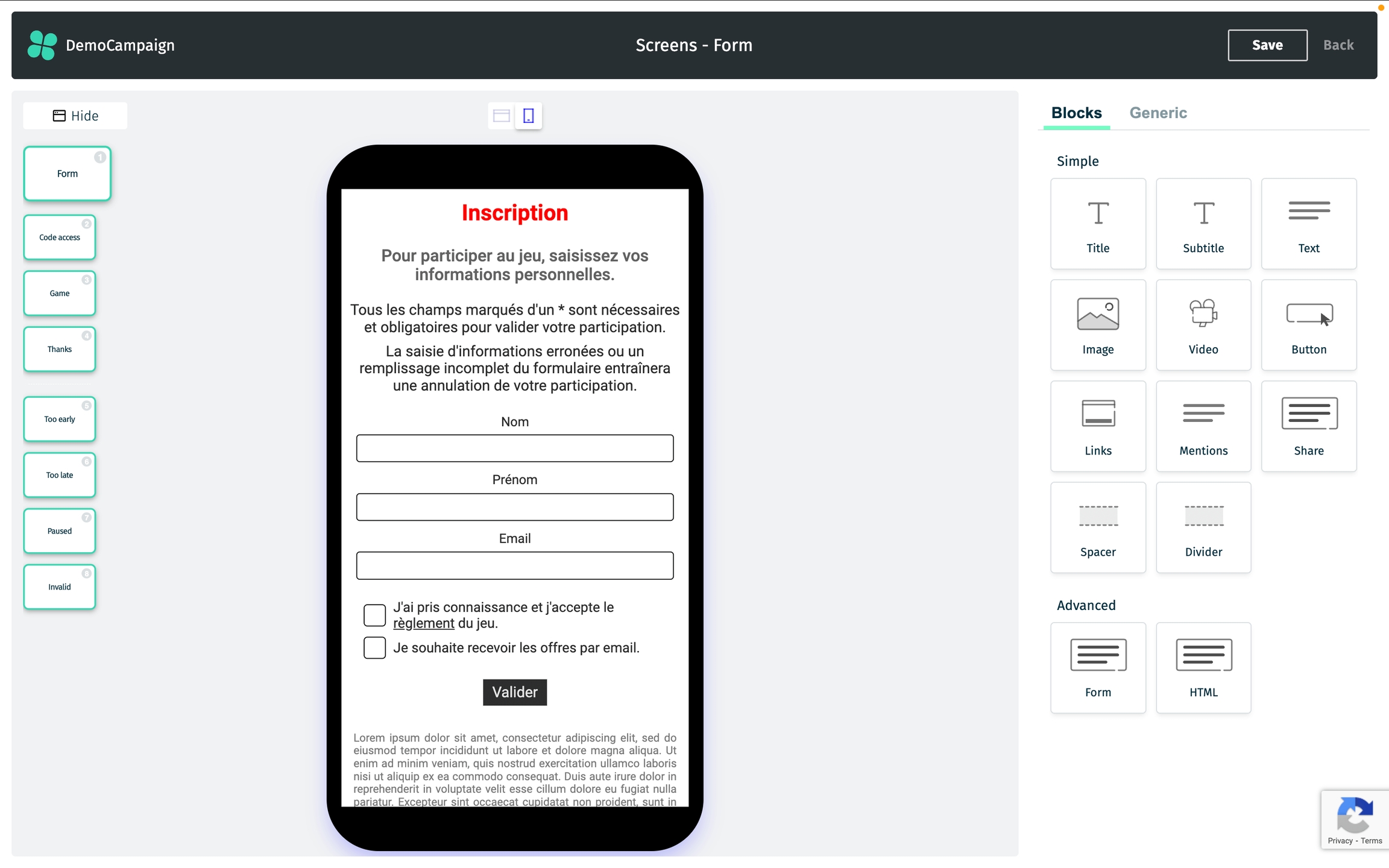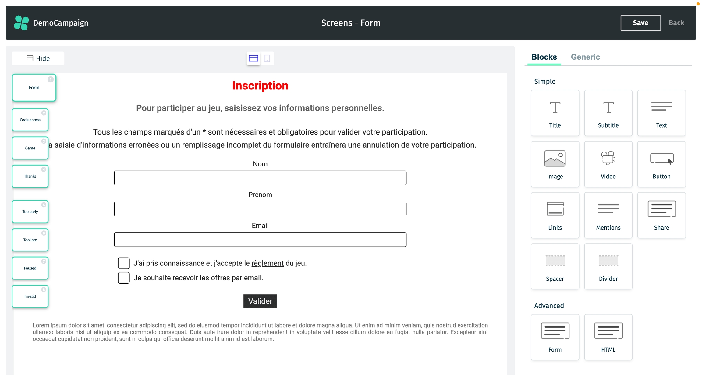 Right Zone: A list of blocks that can be dragged and dropped onto the active screen to customize its content.