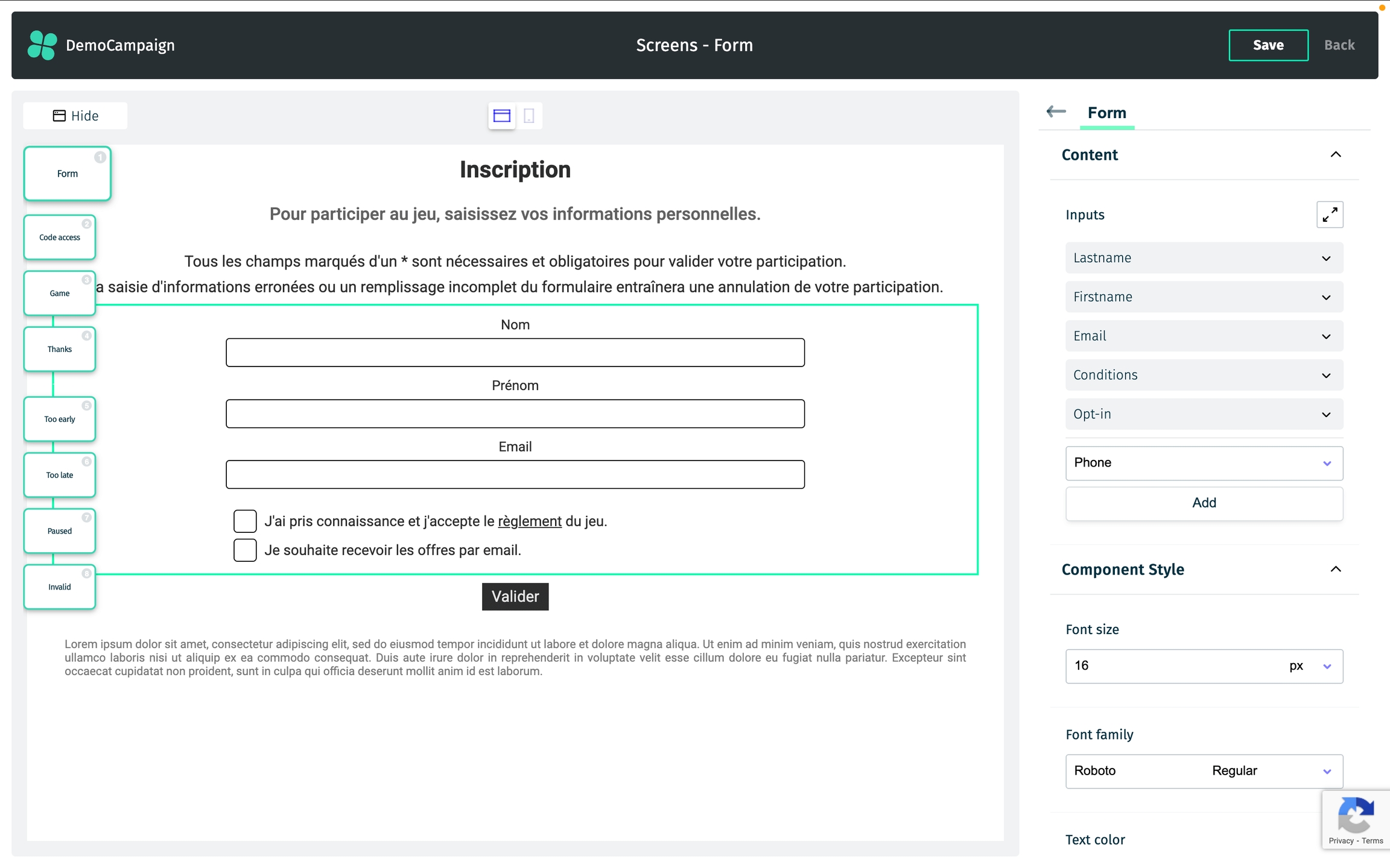 Left Zone: A list of the campaign's screens. Clicking on any screen in this list will switch the current view to that specific screen.