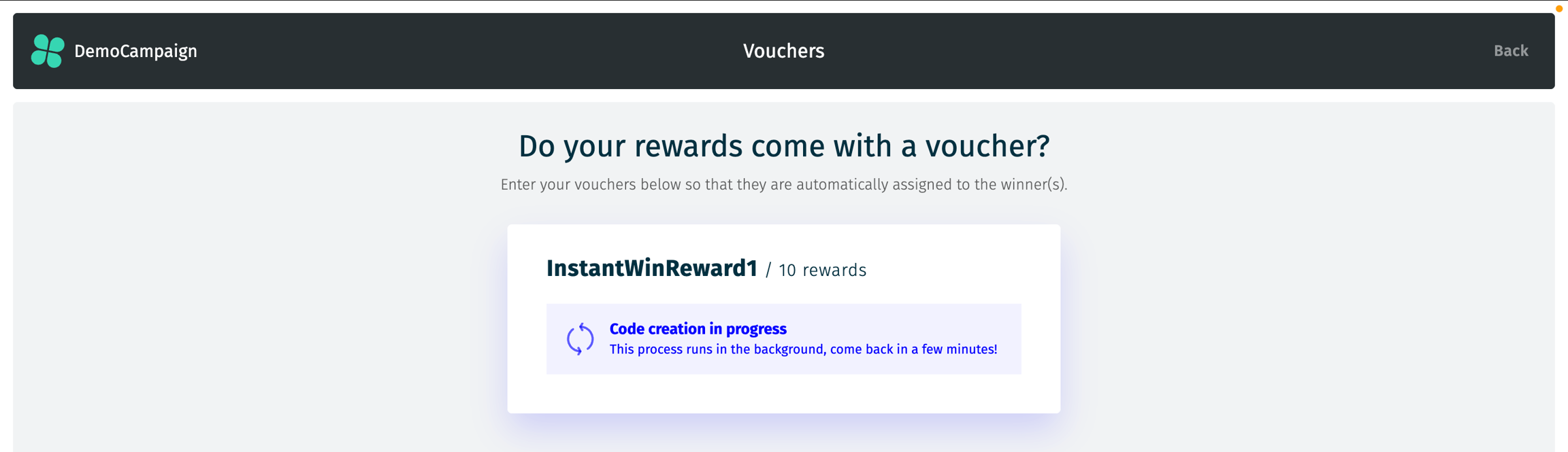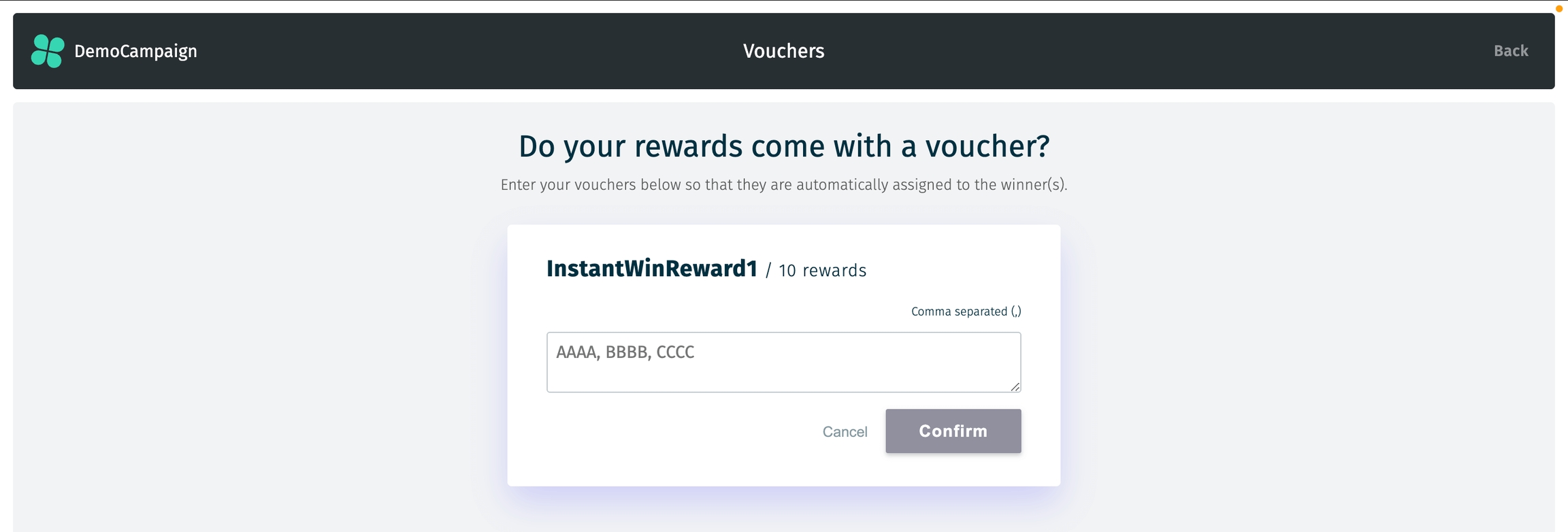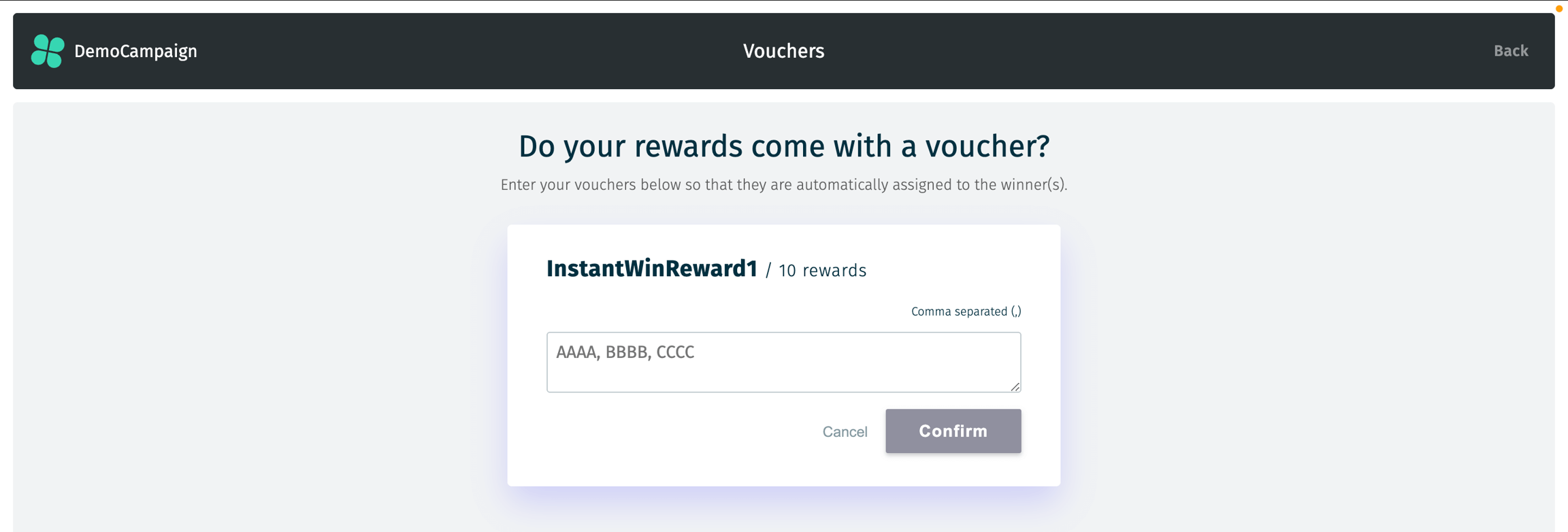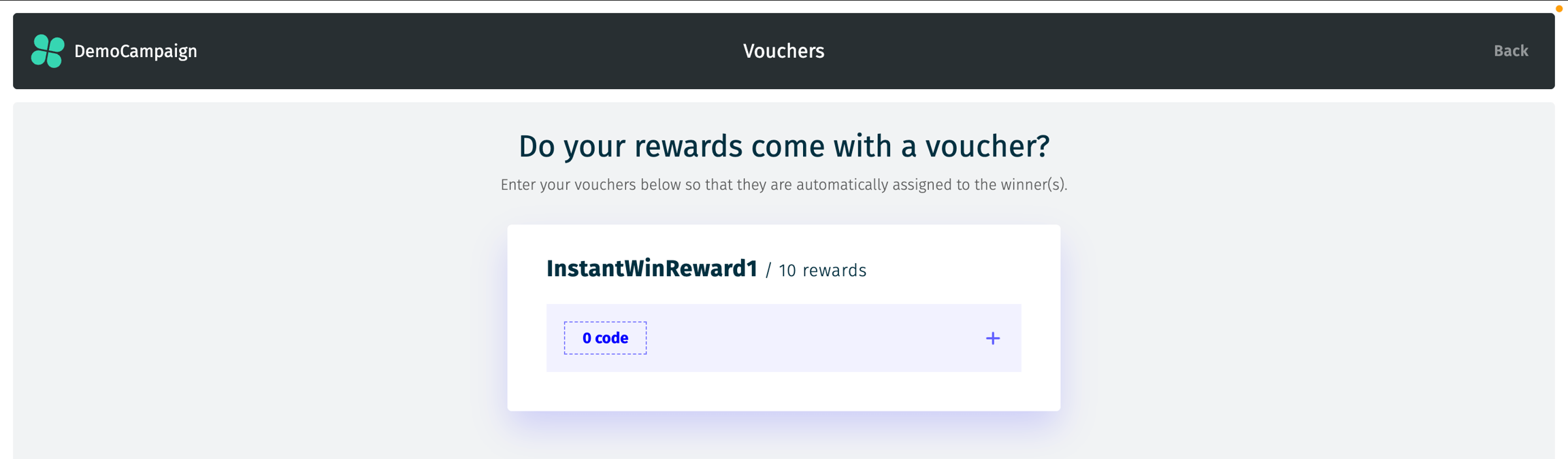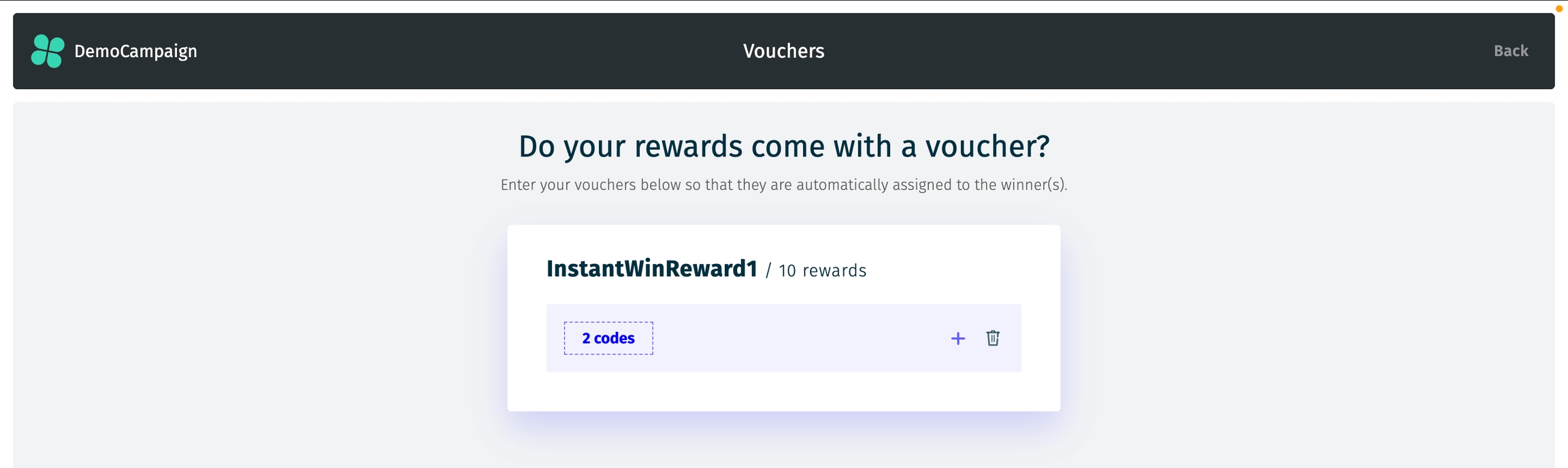 The Vouchers page allows you to add codes for each reward that requires them (flagged on the Rewards screen). The flow is quite simple: