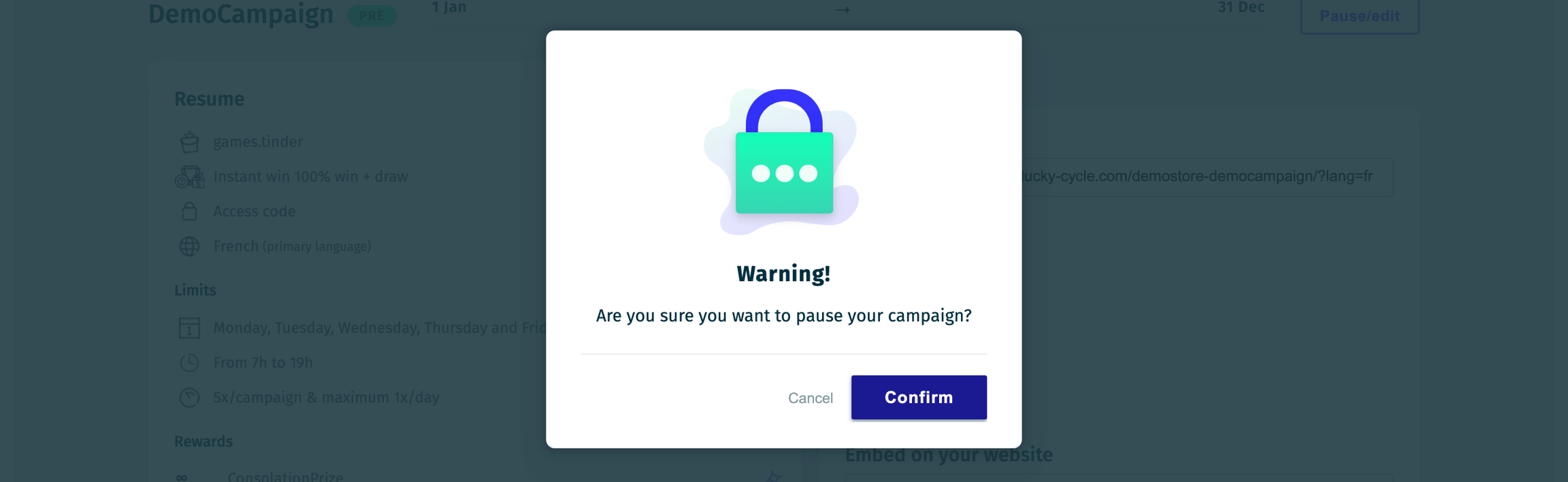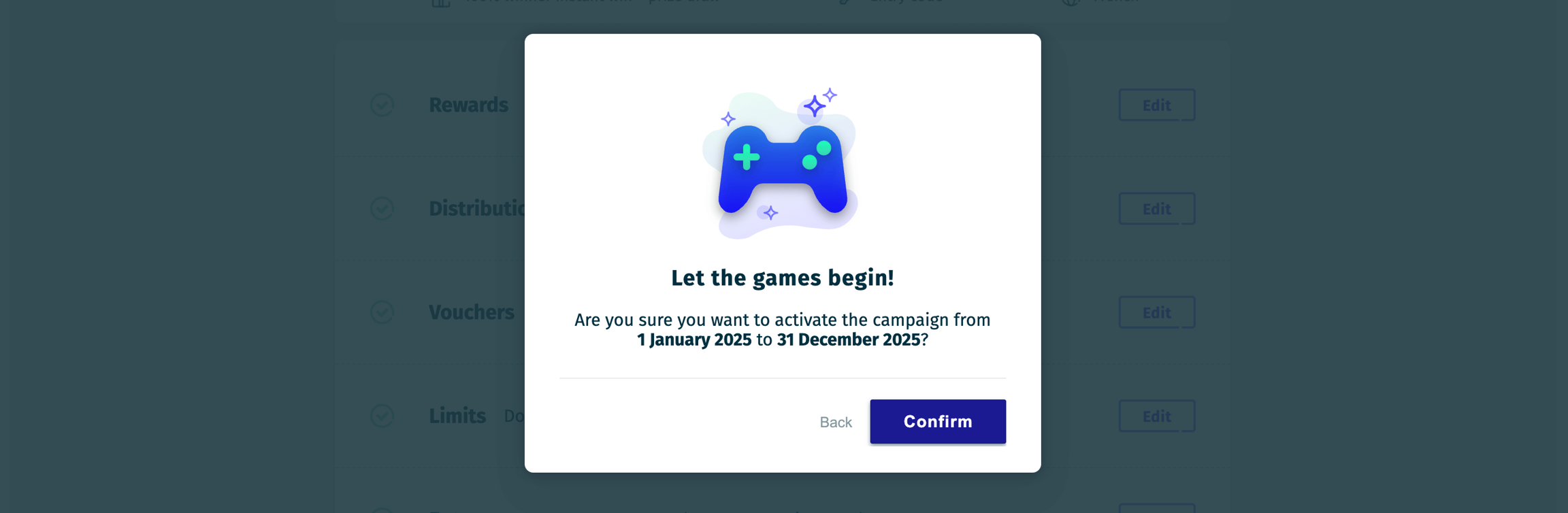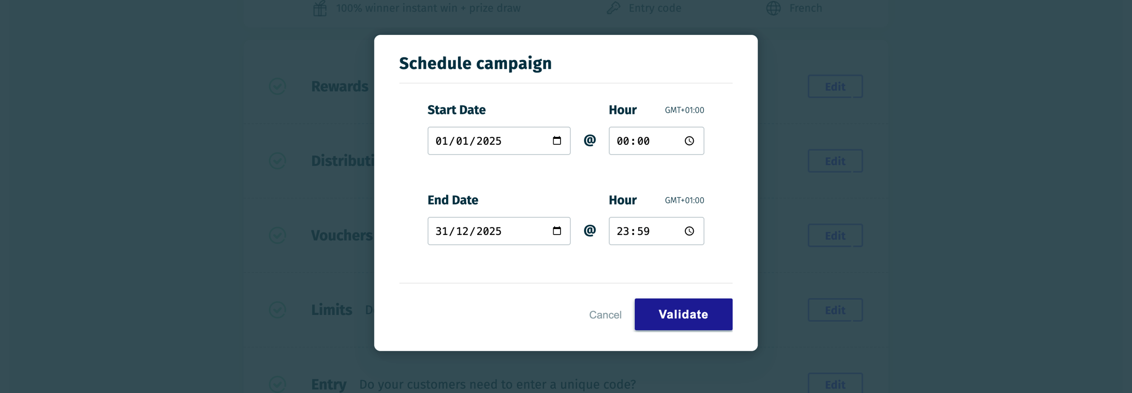 Once your campaign is ready, you can publish it by clicking the button in the top-right corner and specifying its dates.