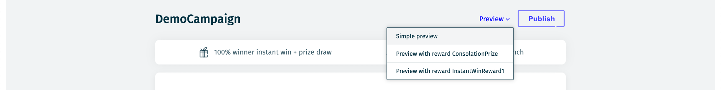 The Preview with Reward [X] option allows you to simulate a specific reward win (applicable only for Instant Win and Consolation prizes).