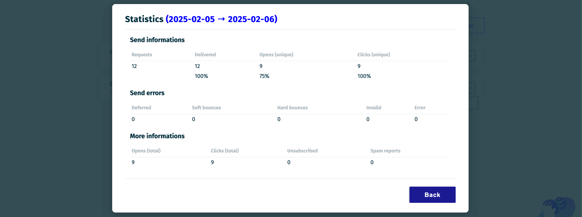 Once a CRM campaign is completed (i.e., all emails have been sent), detailed statistics become available. Here are the key metrics you can track: